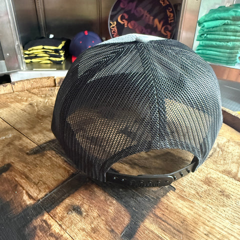 This hat features a black mesh back and poly-cotton grey front with a silver and black Smoking Goose patch.