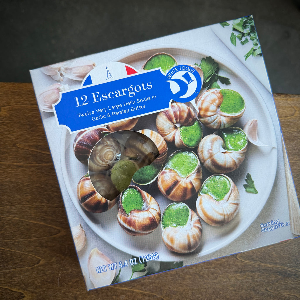 Twelve large helix snails stuffed in shells with garlic and parsley compound butter. Each snail is hand-sorted by size, washed, and cooked in an aromatic bouillon in France's oldest factory, founded in 1796.