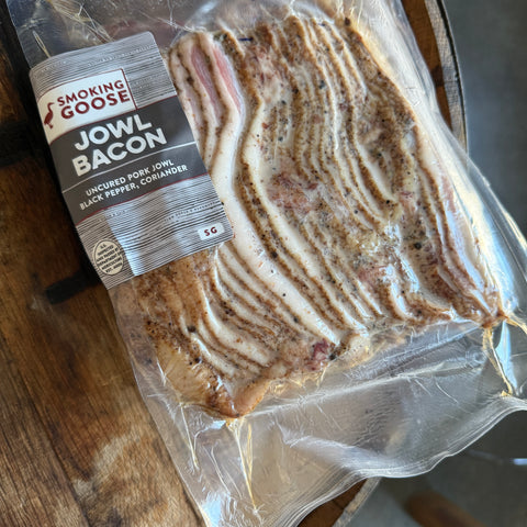 whole pork jowl dry rub cured under a hearty dose of cracked black peppercorns and coriander then smoked over apple wood - the connoisseur’s bacon!
