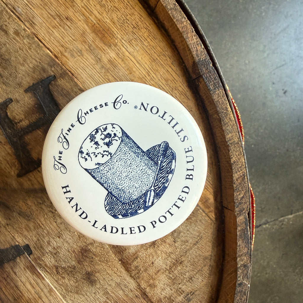 Hand-ladled PDO* Nottinghamshire Potted Blue Stilton in a lidded ceramic pot. Below its wrinkled and crusted rind, the green-blue veined creamy cheese delivers a bold, tangy flavor.