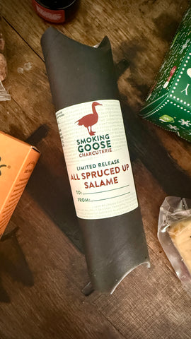 We made this pork salame with locally foraged spruce tips, pink peppercorns, lemon peel, and a touch of clove and Calabrian pepper. Ready to simply slice and serve, it's a delicious holiday special...in limited-edition gift tag labeling. Be sure to check out our Holiday Charcuterie Board Collection: on sale, featuring this salame + pairings.