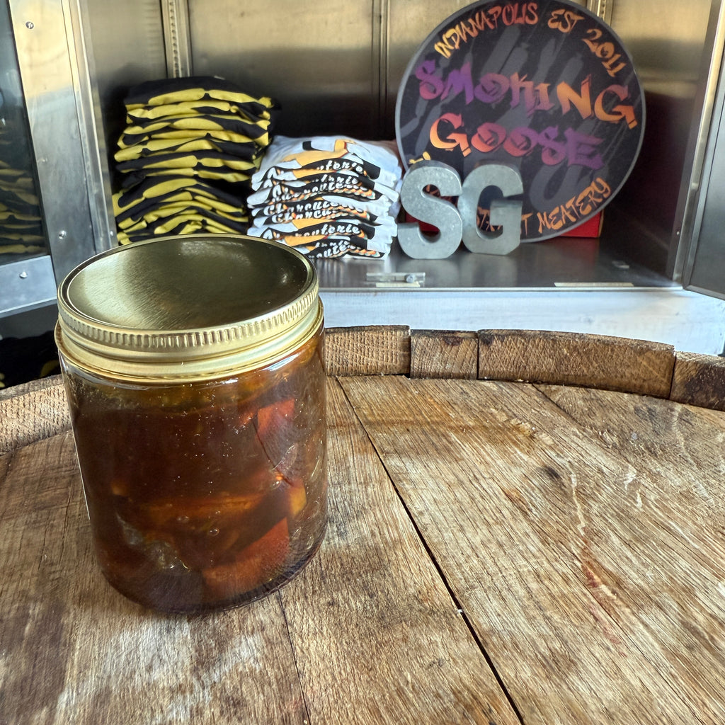 Inspired by the Mexican calabaza en tacha candied pumpkin sweet especially traditional around Dia de los Muertos, we started by smoking local pumpkins over cherry wood and hickory.  After candying these thick smoked pumpkin slices under a spiced caramel sauce, we blended in candied oranges and lemons with cinnamon, ginger, black pepper, and more.