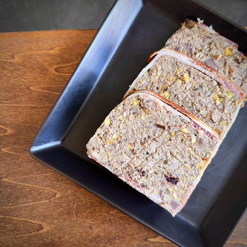 We braised duck with brandy, port, shallot, garlic, and spices before blending in Berkshire pork, smoked pistachio, dried cranberries, and candied blood orange peel. After lining terrine molds with slices of our Applewood Bacon, we packed this rich mixture to cook low and slow.