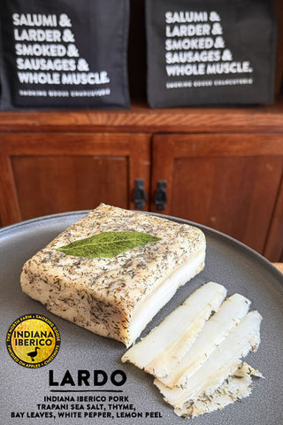 Silky pork back fat cured with Tripani sea salt, thyme, white pepper, bay leaves and lemon peel...made from Iberico hogs pasture-raised in Indiana and finished on a diet of chestnuts + apples.