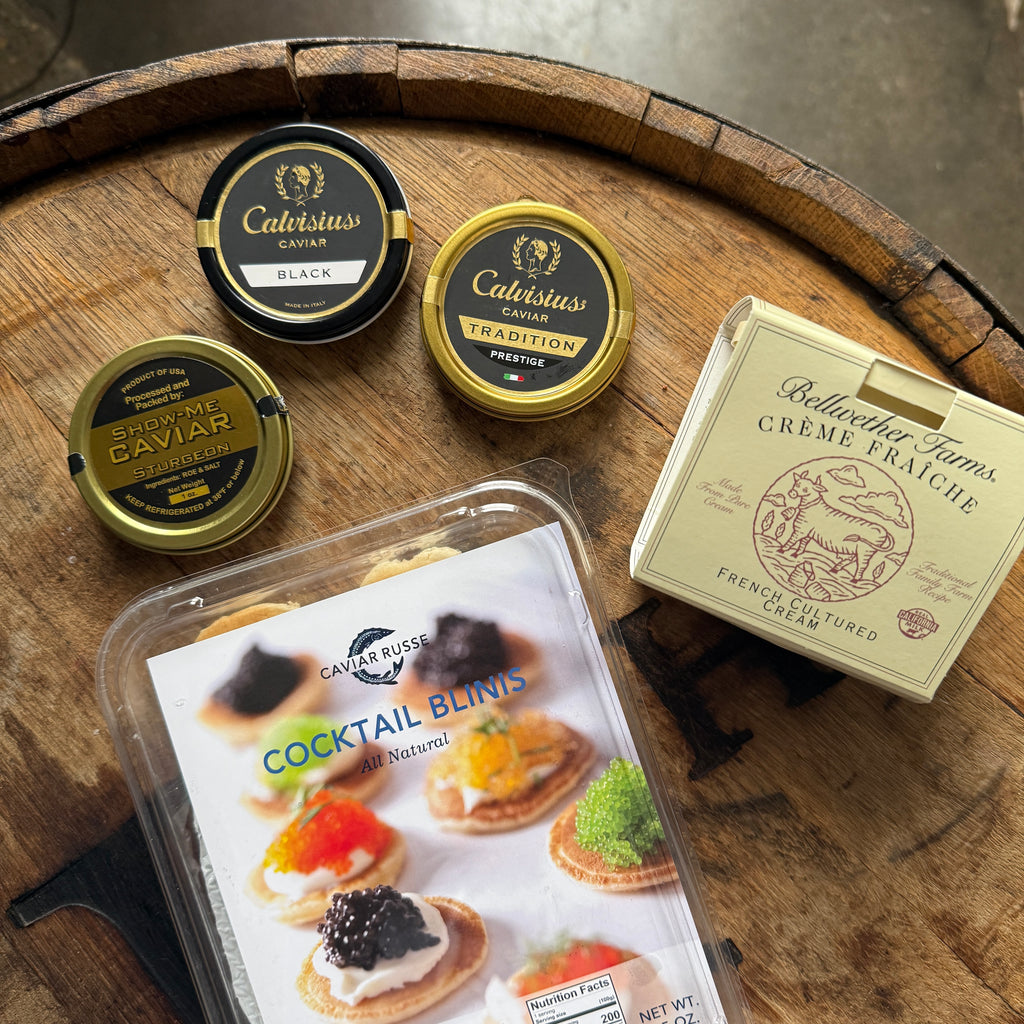Each collection serves 6+ and includes one package of Caviar Russe Cocktail Blini plus Bellwether Farms' crème fraîche and your choice of one tin of caviar including: