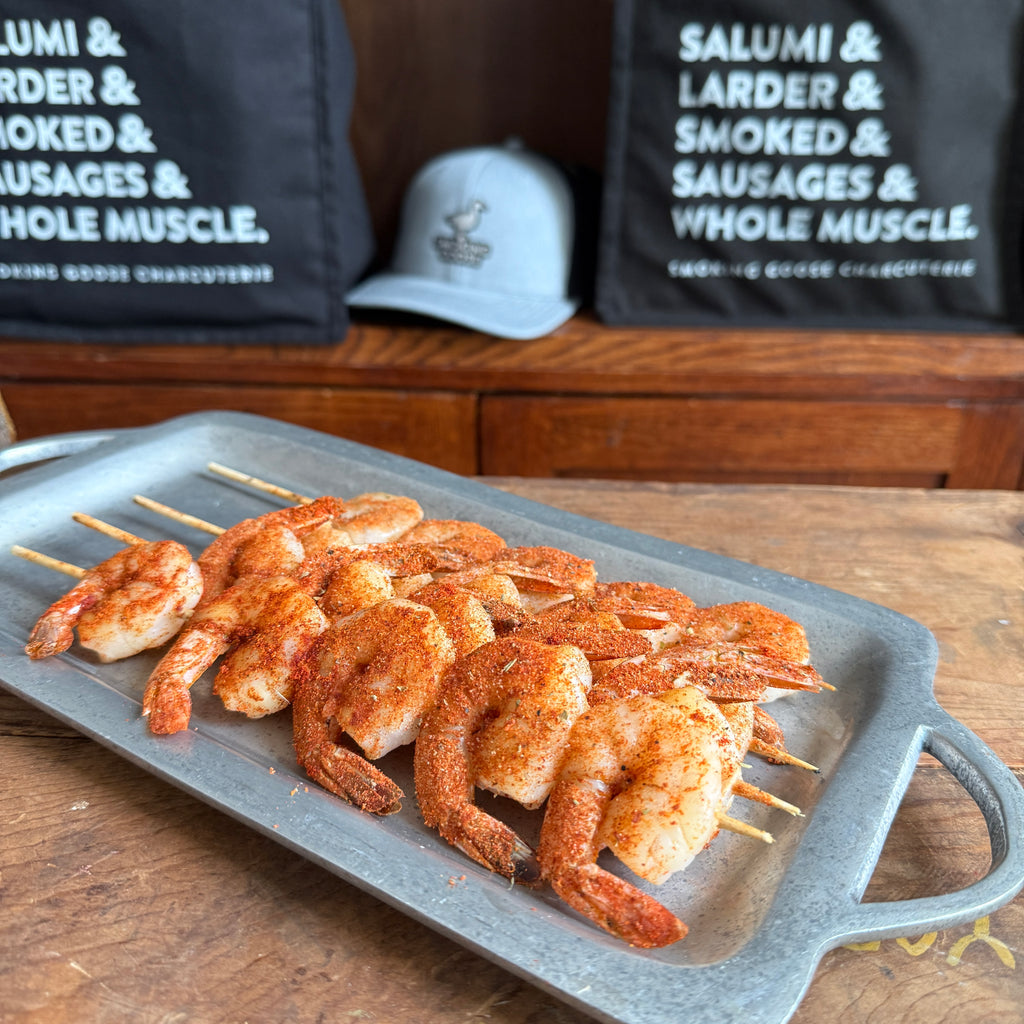 We brined tail-on shrimp under citrus and spices before smoking them over peach wood.