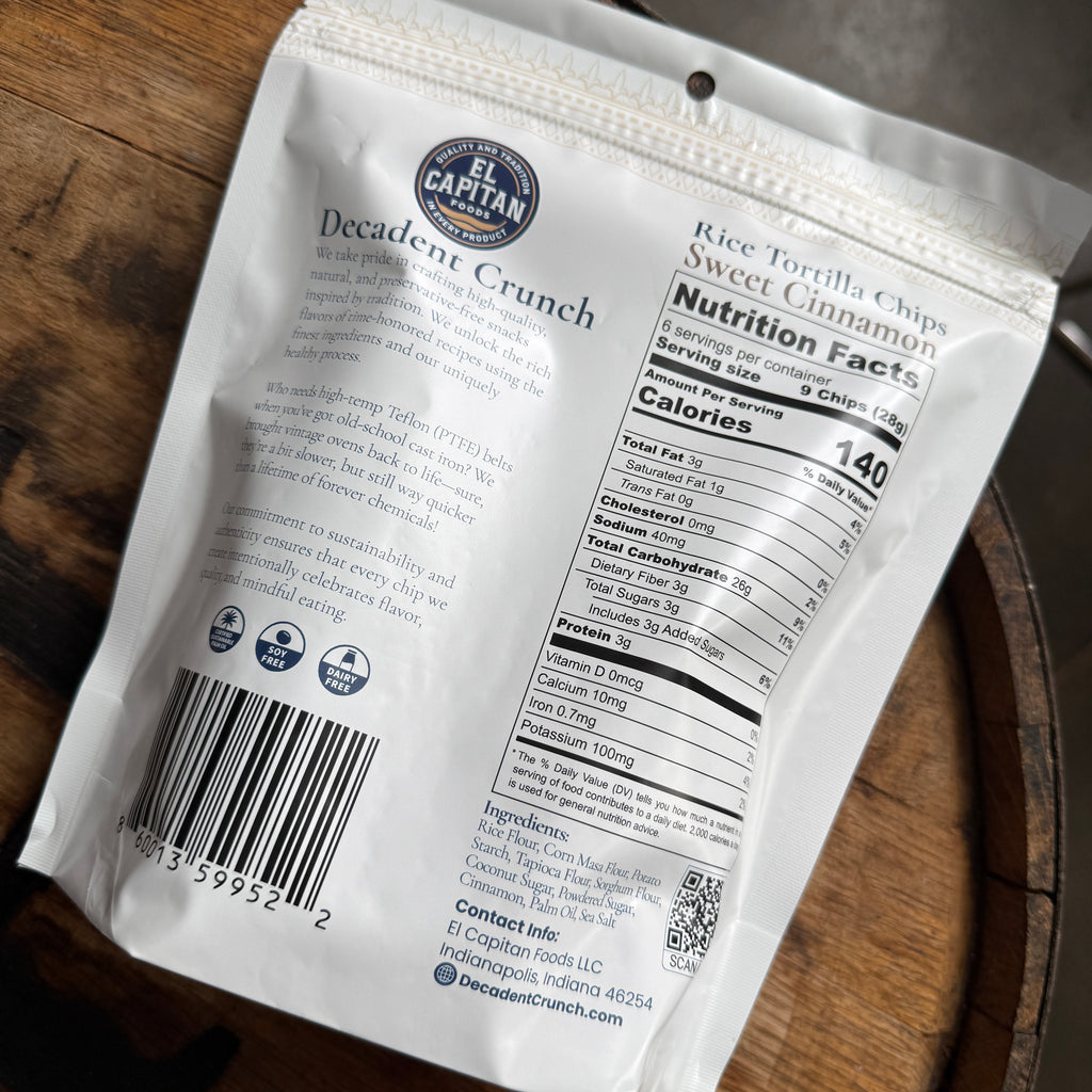Sweet Cinnamon: Rice Flour, Corn Masa Flour, Potato Starch, Tapioca Flour, Sorghum Flour, Coconut Sugar, Powdered Sugar, Cinnamon, Palm Oil, Sea Salt