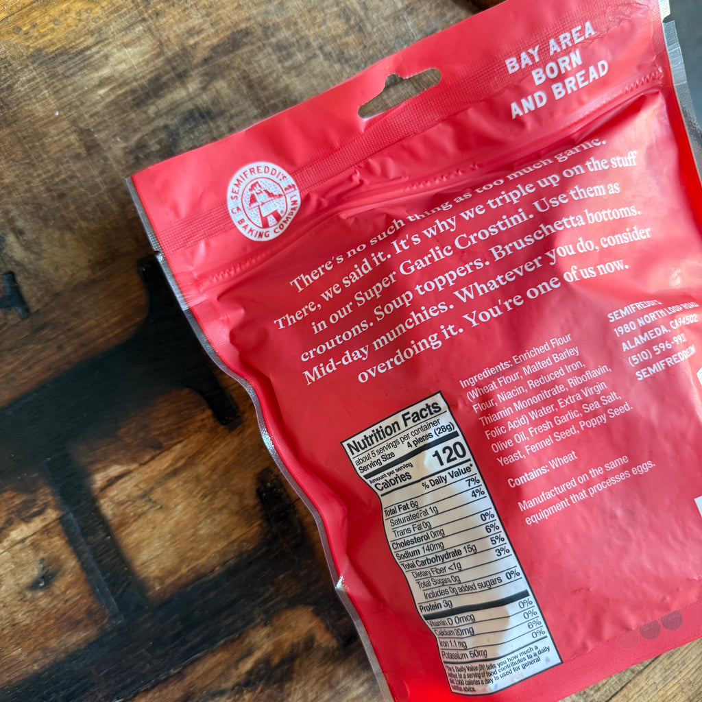 Super Garlic: Enriched Flour (wheat flour, malted barley flour, niacin, reduced iron, thiamine mononitrate, riboflavin, folic acid), Water, 100% Extra Virgin Olive Oil, Fresh Garlic, Salt, Yeast, Fennel Seeds, and Poppy Seeds.