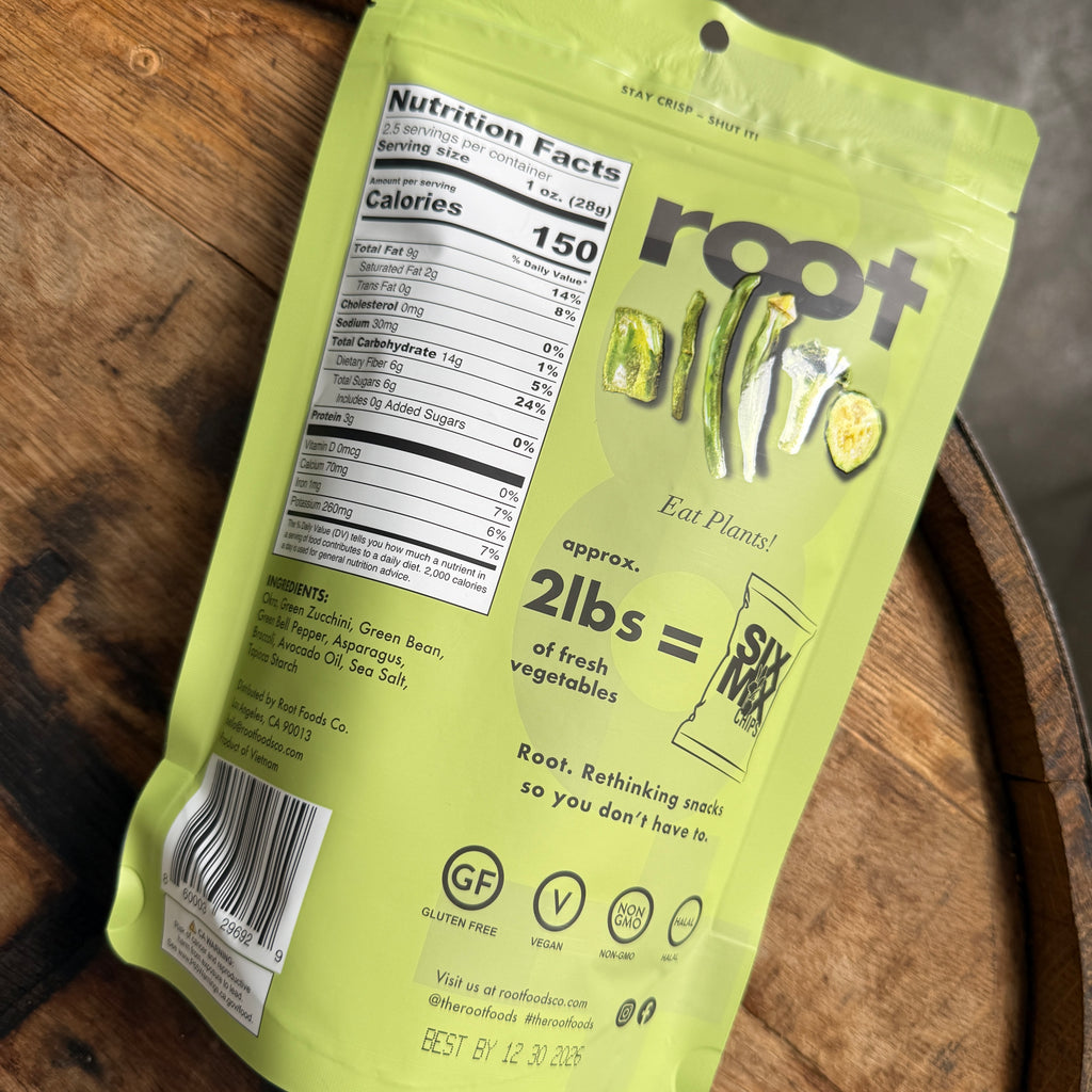 Six Mix: Okra, Green Zucchini, Green Bean, Green Bell Pepper, Asparagus, Broccoli, Avocado Oil, Sea Salt, Tapioca Starch