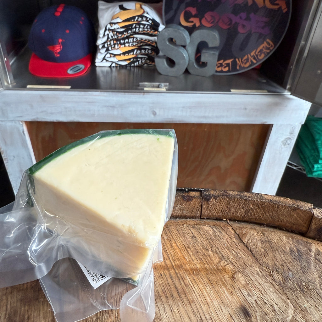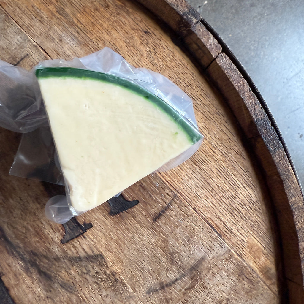 These wheels of creamy English Cheddar blended with champagne are dipped in a vibrant green wax.